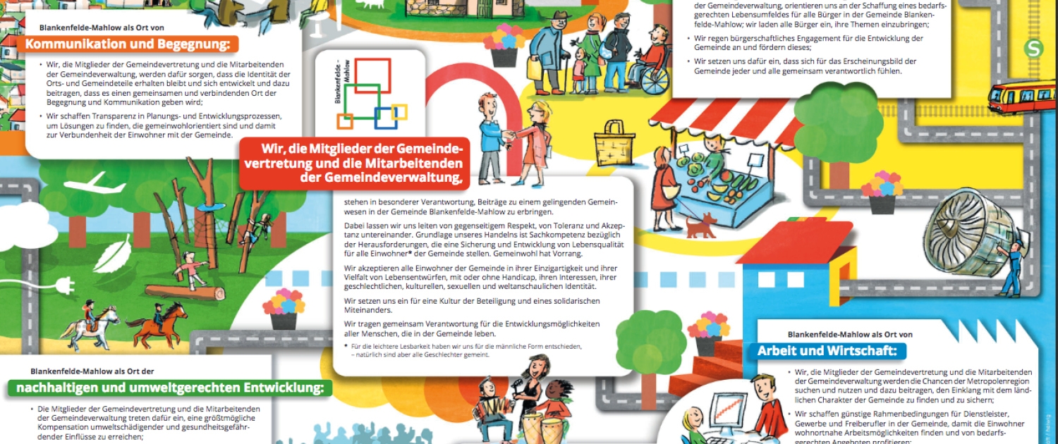 Das im Jahr 2017 von der Gemeindevertretung einstimmig beschlossene Leitbild der Gemeinde Blankenfelde-Mahlow kann sich sehen lassen. Allein schon durch seine visuelle Gestaltung ist das Leit-Bild, das die Prinzipien und das Selbstverständnis der Gemeinde beschreibt, ein echter Hingucker. Um einen zentralen Text angeordnet, gliedert es sich in fünf Themenbereiche und fasst so Visionen für das Zusammenleben in der Gemeinde zusammen.